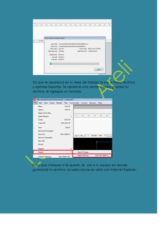 Este documento proporciona instrucciones en 3 pasos para insertar un video en Macromedia Flash: 1) Seleccionar el video desde la opción "Navegar"; 2) Configurar las opciones del video para Flash 8; 3) Guardar el archivo y exportarlo para verlo en el navegador.