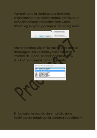 Este documento proporciona instrucciones en 27 pasos para exportar un video en formato SWF desde un programa de edición de video. Incluye pasos como importar el video, seleccionar la calidad y el archivo de reproducción, guardar el video exportado con un nuevo nombre y formato, y reproducirlo en un explorador.