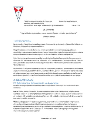 Este documento resume conceptos clave sobre la demanda. Explica que la demanda se refiere a la cantidad total de un bien o servicio que la gente desea adquirir y depende de factores como el precio, la oferta disponible, el lugar, la capacidad de pago y las necesidades y deseos. También describe la elasticidad precio de la demanda y los diferentes tipos de elasticidad, e indica que para conocer la demanda del mercado se debe realizar un estudio de mercado.