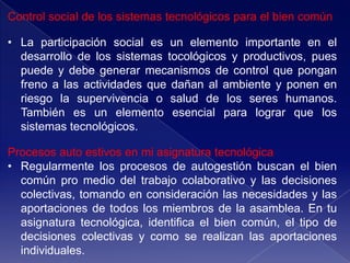 La participación social es importante en el desarrollo de sistemas tecnológicos ya que puede generar mecanismos de control para frenar actividades dañinas al ambiente. Los procesos de autogestión buscan el bien común a través del trabajo colaborativo y decisiones colectivas considerando las necesidades de todos. Los productos tecnológicos deben satisfacer las necesidades de los consumidores reunir características que los hagan competitivos y de calidad para ser aceptados en el mercado.