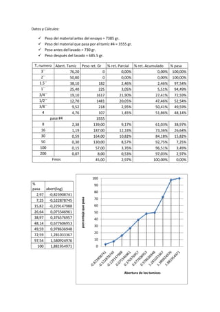 El documento describe el procedimiento para realizar un análisis granulométrico de arena seca utilizando una serie de tamices y balanzas. Se pesó la arena antes y después del tamizado y lavado para determinar el porcentaje retenido en cada tamiz. Los resultados incluyen el diámetro efectivo, el coeficiente de uniformidad, el diámetro máximo y el porcentaje de áridos gruesos, finos y arena.