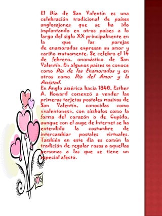 El documento describe la tradición del Día de San Valentín. Se celebra el 14 de febrero y se originó en países anglosajones, extendiéndose a otros lugares en el siglo XX. Las parejas expresan su amor mutuamente en esta fecha. En 1840, Esther A. Howard comenzó a vender tarjetas postales masivas de San Valentín con símbolos como corazones y Cupido, aunque ahora también se intercambian postales virtuales.