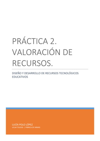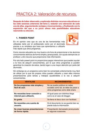 Este documento presenta una valoración de siete recursos educativos tecnológicos: PowerPoint, Photoshop, Jclic, Nero Visión, FrontPage, pizarra digital y libro virtual. El autor argumenta que Jclic y la pizarra digital son los mejores recursos debido a que hacen el aprendizaje más lúdico e interactivo, mientras que Photoshop tiene menos utilidad educativa. También señala que PowerPoint es el programa más fácil de usar para que los estudiantes creen trabajos.