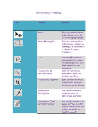 Este documento presenta las diferentes herramientas de Photoshop, incluyendo sus nombres e iconos, así como una breve descripción de la función de cada una. Se describen herramientas para mover, seleccionar, recortar, pintar, borrar, agregar texto y formas, y realizar ajustes de color y desenfoque. El documento proporciona información sobre 18 herramientas básicas de Photoshop.