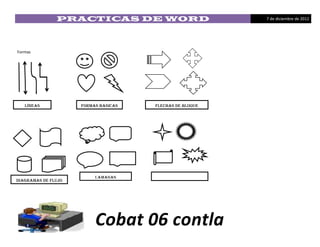 El documento describe diferentes formas y diagramas que se pueden crear en Microsoft Word, incluyendo líneas, flechas de bloque, formas básicas, diagramas de flujo y COBAT 06.