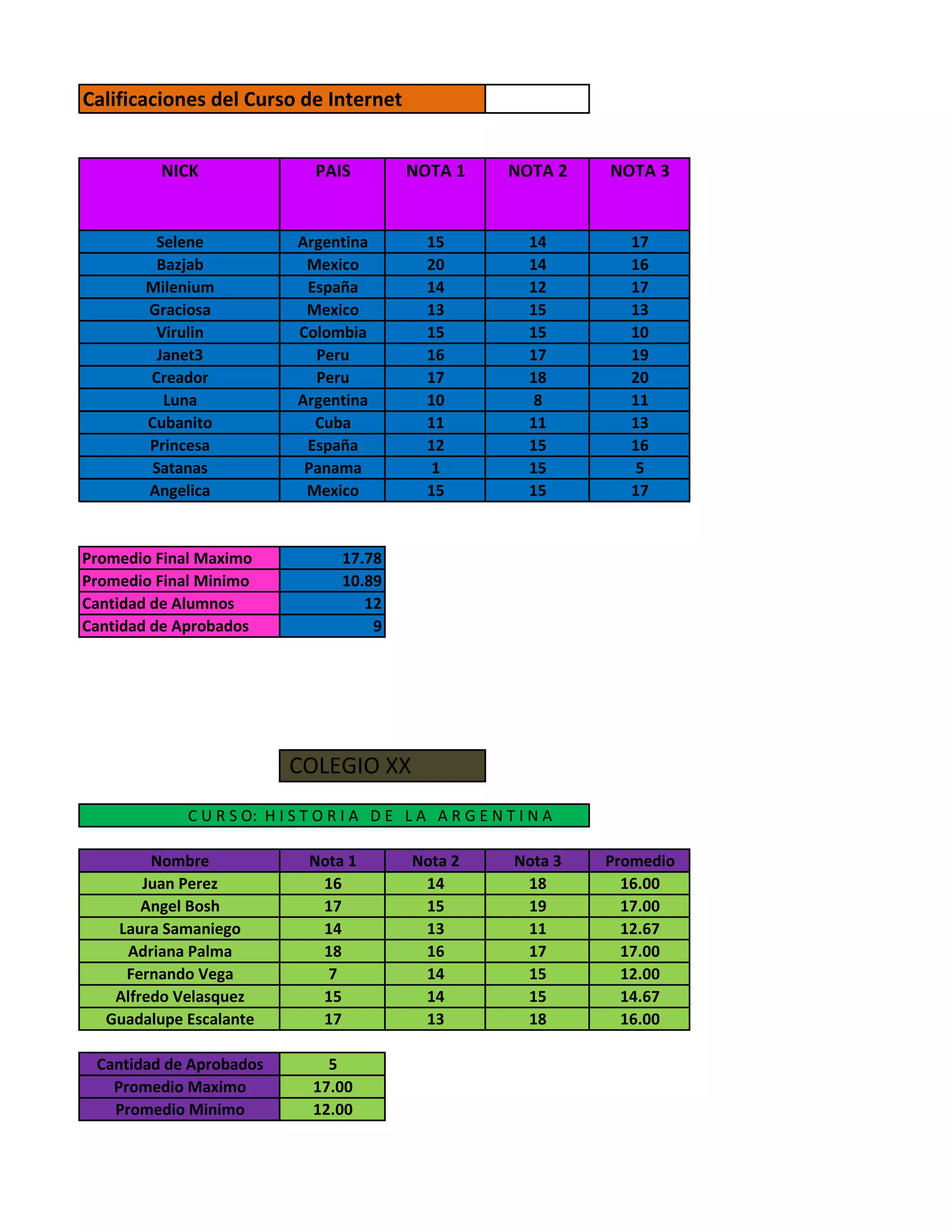 El documento presenta información sobre las calificaciones de varios estudiantes en diferentes cursos. Incluye tablas con los nombres de los estudiantes, sus notas y promedios, así como datos agregados como el promedio máximo, mínimo y la cantidad de estudiantes aprobados.