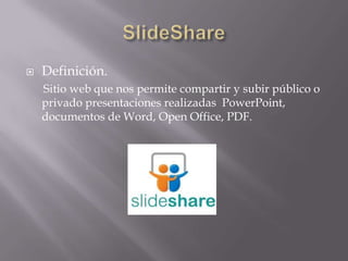 Este documento define Scribd como un sitio web que permite a los usuarios compartir y publicar presentaciones, documentos, libros electrónicos y otros archivos de forma pública o privada. Explica que Scribd ofrece a los autores una manera de distribuir sus obras sin la necesidad de una editorial tradicional y permite a los usuarios etiquetar documentos para facilitar su búsqueda y formar comunidades en torno a intereses compartidos.