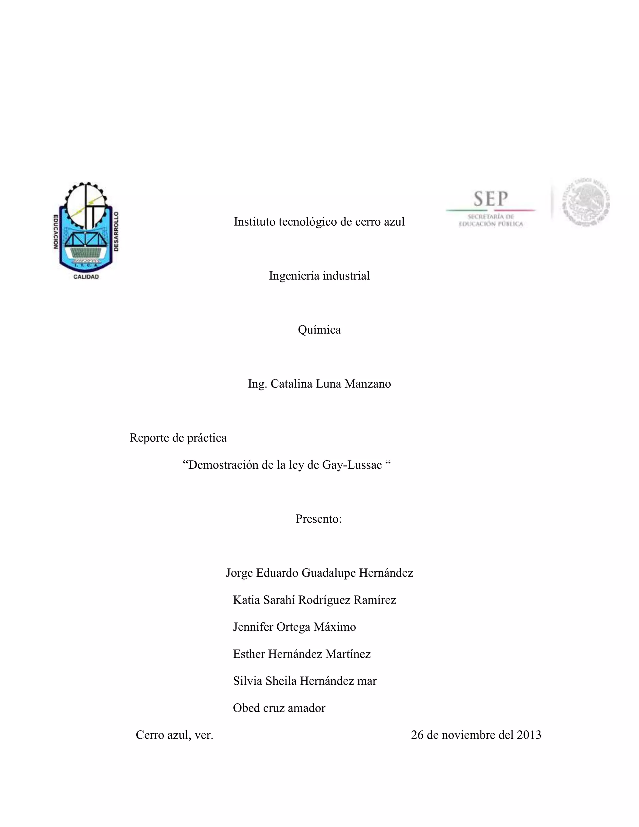 Este documento presenta un reporte de una práctica realizada para demostrar la ley de Gay-Lussac sobre el comportamiento de los gases. La práctica involucró enfriar un frasco con hielo y agua, lo que causó que la presión dentro del frasco aumentara y empujara una moneda en la parte superior, validando así que un aumento en la temperatura causa un aumento en la presión de acuerdo a la ley de Gay-Lussac.