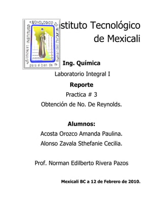 Este reporte describe una práctica de laboratorio para obtener el número de Reynolds en dos tuberías de diferentes diámetros. Se explican conceptos como flujo laminar, turbulento y la fórmula del número de Reynolds. Luego, se detalla el diseño experimental para medir el flujo de agua y calcular el número de Reynolds para diferentes lecturas de caudal. Finalmente, se presentan las tablas de resultados y una gráfica que muestran cómo el número de Reynolds aumenta con el caudal.