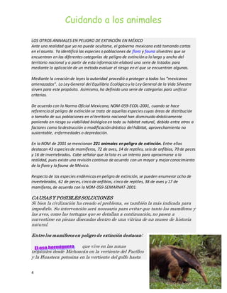 El documento describe varios animales en peligro de extinción en México de acuerdo con la Norma Oficial Mexicana NOM-059-ECOL-2001. Menciona que 221 animales están en peligro, incluyendo 43 mamíferos, 72 aves, 14 reptiles, 6 anfibios y 70 peces. Describe algunas de las especies amenazadas como el ocelote, el tigrillo, el jaguar, la vaquita marina y varias tortugas marinas. Explica que la destrucción del hábitat, la caza y la contaminación son las