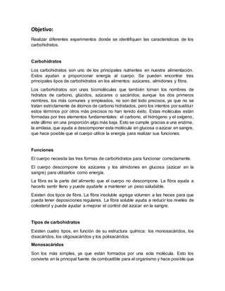 Este documento describe varias pruebas para identificar carbohidratos, incluyendo las pruebas de Bencidina, Anilina, Tollens, Fehling y Benedict. Explica que la prueba de Bencidina es positiva para pentosas mientras que las pruebas de Anilina y Fehling son negativas para la mayoría de carbohidratos probados. También provee resultados para cada carbohidrato probado en las pruebas de Tollens, Fehling y Benedict.