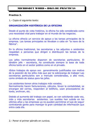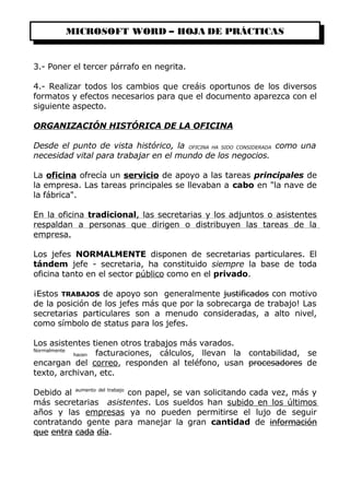 Este documento describe los cambios formales realizados a un texto sobre la organización histórica de las oficinas. Se aplicaron varios formatos y efectos al texto, incluyendo poner párrafos en cursiva y negrita, cambiar los márgenes, la orientación de la página, mover y copiar párrafos, y cambiar el tipo y color de letra del título y otros párrafos. El documento finalizado se guardó con el nombre "Práctica 3".