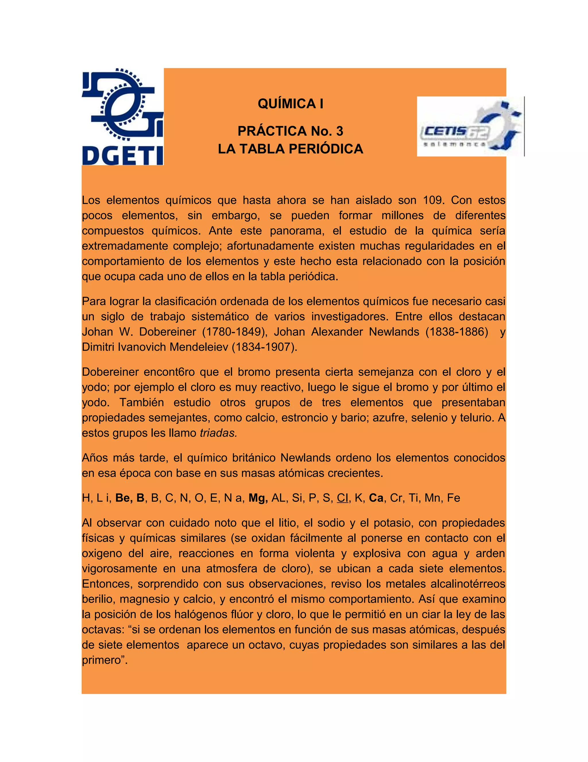 Este documento describe la historia y desarrollo de la tabla periódica de los elementos, incluyendo las contribuciones clave de Dobereiner, Newlands y Mendeleiev. Explica cómo la tabla clasifica a los elementos actualmente conocidos de acuerdo a sus números atómicos y propiedades periódicas, dividiéndolos en grupos y períodos. También presenta varios experimentos químicos para analizar las propiedades de algunos elementos representativos.