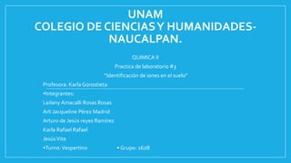 Este experimento buscó identificar iones presentes en una muestra de suelo a través de sustancias reveladoras. Se colocó el suelo con ácido nítrico y sustancias como nitrato de plata, cloruro de bario y sulfato de potasio para identificar los iones cloruro, sulfato, hierro y carbonato. Se observó la formación de precipitados y efervescencia, lo que indica la presencia de dichos iones en el suelo.
