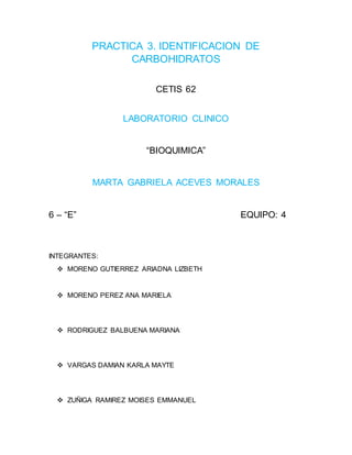 Este documento presenta los resultados de varias prácticas realizadas para identificar carbohidratos. Se realizaron pruebas con la bencidina, la anilina, Tollens, Fehling y Benedict para diferentes carbohidratos como la xilosa, glucosa, maltosa y fructuosa. Los resultados mostraron que la xilosa y L-arabinosa dieron positivo con la anilina, mientras que solo la glucosa anhidra dio positivo con Fehling. Con Benedict, la maltosa fue positiva. Las pruebas ayudaron a identificar los