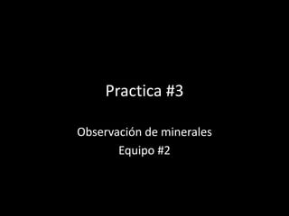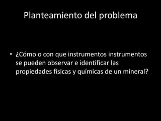 Este documento describe un experimento para observar e identificar las propiedades físicas y químicas de varios minerales. Se observan minerales a simple vista y con microscopio para ver sus colores y texturas. Luego, se miden la densidad, dureza y magnetismo de los minerales, y se analiza su composición química usando reactivos como ácido clorhídrico y nitrato de plata para identificar sulfuros, carbonatos y haluros. El objetivo es comprender mejor las características y clasificación de