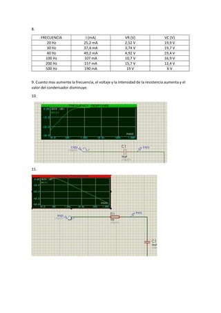 Este documento presenta los resultados de una práctica de circuitos RC. Contiene tablas con valores de corriente, voltaje y desfase medidos para diferentes frecuencias de entrada. También observa que a medida que aumenta la frecuencia, el voltaje e intensidad en la resistencia aumentan mientras que el voltaje en el condensador disminuye.