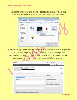 El documento describe los pasos para subir un video a YouTube. Estos incluyen iniciar sesión en una cuenta de Google o YouTube, hacer clic en la opción "Subir video", seleccionar el video desde el ordenador, y completar la información como el título, descripción y etiquetas. Luego se configuran las opciones avanzadas y se espera a que termine de cargar el video.
