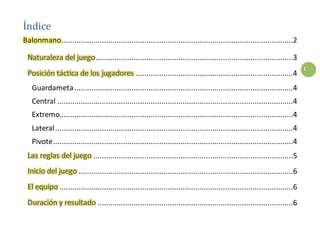 El documento describe el deporte del balonmano. Se juega entre dos equipos de 7 jugadores cada uno (6 jugadores de campo y un portero) con el objetivo de introducir una pelota en la portería contraria utilizando principalmente las manos. El terreno de juego es un rectángulo de 40m x 20m dividido en dos mitades iguales con una portería en cada lado. El equipo que marque más goles al final del partido es el ganador.