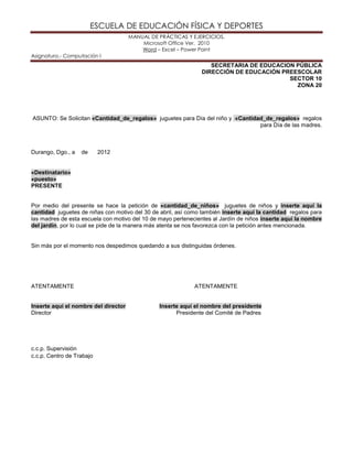 Este documento es un manual de prácticas y ejercicios para una escuela de educación física y deportes. Incluye información sobre el uso de Microsoft Office 2010, incluyendo Word, Excel y PowerPoint. También contiene una solicitud de donaciones de juguetes para el Día del Niño y regalos para el Día de las Madres de parte de una escuela primaria en Durango, México.