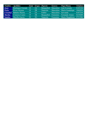 La tabla proporciona información sobre 5 estudiantes, incluyendo su nombre, apellidos, edad, grupo, deporte favorito, género, nombre de sus padres y número de teléfono. Los datos se refieren a 2 estudiantes de 18 años en el grupo 2B que practican natación y fútbol, y 3 estudiantes de 19-20 años en los grupos 2A, 2B y 2G que juegan basquetbol o practican natación.