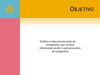 Este documento proporciona instrucciones para inspeccionar un archivo de Excel antes de compartirlo para verificar que no contenga información oculta o personal. Se recomienda hacer clic en el botón de Excel, seleccionar la opción "Preparar" y luego hacer clic en "Inspeccionar documento".