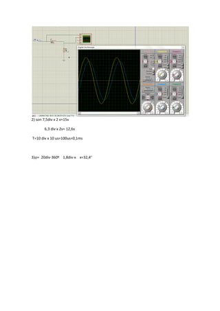 Este documento presenta cálculos y resultados de mediciones realizadas en un circuito RC. Se midieron voltajes, corrientes y fases para diferentes frecuencias aplicadas al circuito, observando que a mayor frecuencia el voltaje en la resistencia disminuye mientras que el voltaje en la línea aumenta, debido a que la bobina se comporta como una resistencia mayor a altas frecuencias.