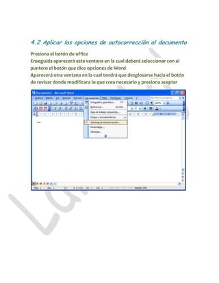 Este documento proporciona instrucciones para revisar y editar documentos electrónicos, incluyendo verificar la ortografía y gramática, aplicar opciones de autocorrección, usar el control de cambios, guardar documentos con un nombre, e imprimir documentos. Explica cómo acceder a estas opciones a través de los menús y barras de herramientas en programas de oficina comunes.