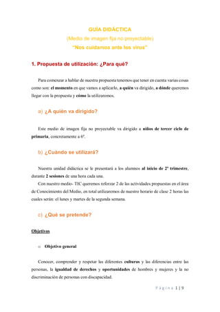 Este documento presenta una guía didáctica para una unidad sobre los virus dirigida a estudiantes de 6o grado. Incluye un medio TIC interactivo en forma de bingo didáctico para enseñar sobre diferentes tipos de virus y sus síntomas. La guía describe el uso del medio TIC, incluyendo actividades previas, durante y posteriores para involucrar a los estudiantes de manera dinámica y divertida.
