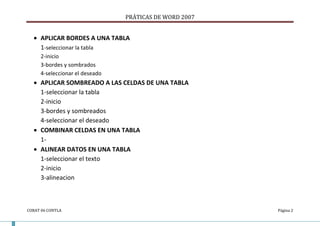 El documento presenta una lista de calificaciones de varios alumnos en diferentes materias y el promedio por alumno y materia. Luego incluye instrucciones sobre cómo aplicar bordes y sombreado a una tabla, combinar celdas, alinear datos y cambiar la fuente en una tabla.