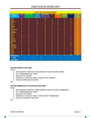 Este documento presenta una lista de calificaciones de estudiantes con sus nombres y calificaciones en diferentes asignaturas, así como el promedio general por estudiante. También incluye instrucciones sobre cómo aplicar bordes, sombreado, combinar celdas y realizar otros formatos en tablas de Word.