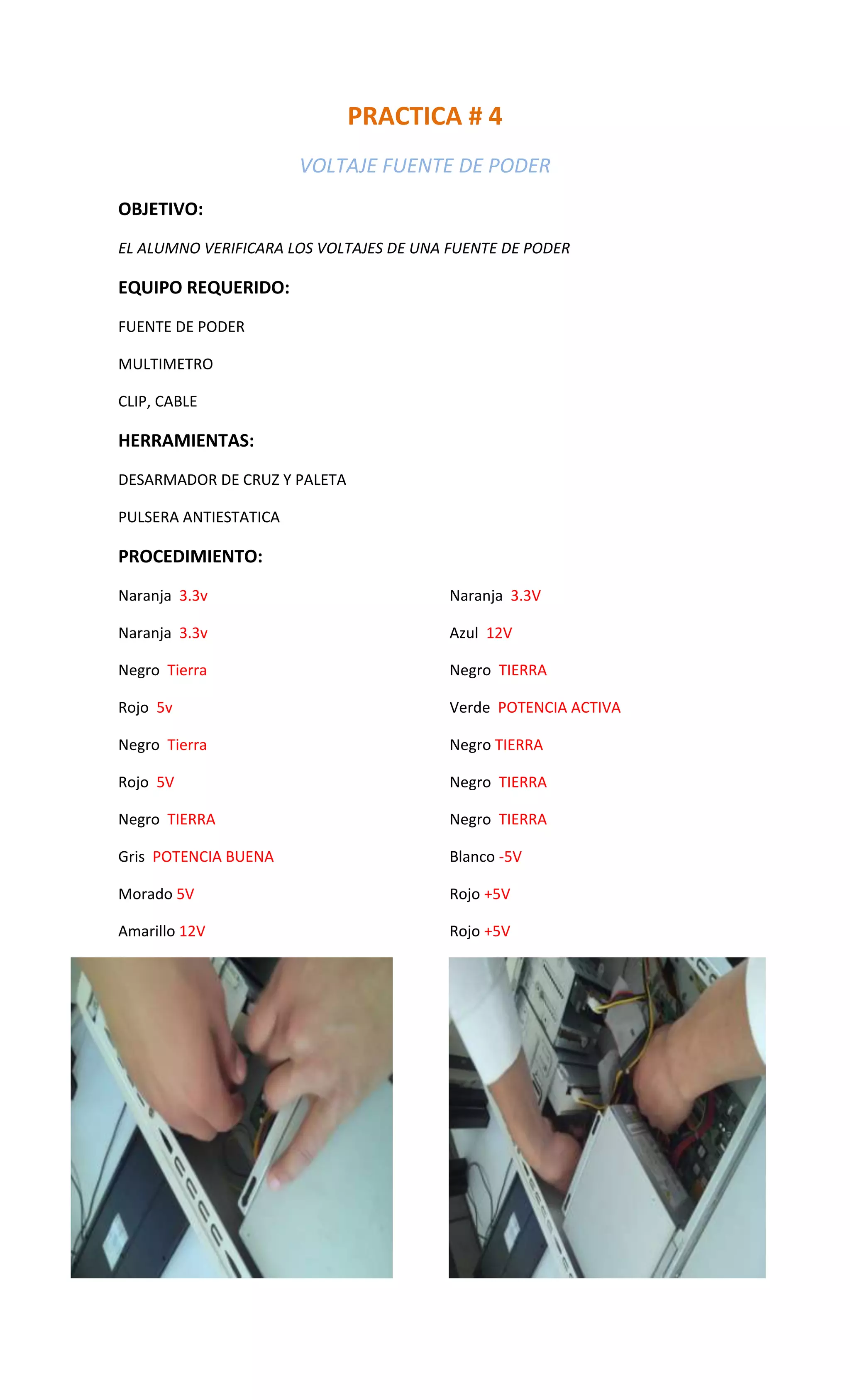 El documento describe un procedimiento para verificar los voltajes de una fuente de poder. Se requiere una fuente de poder, un multímetro, clips y cables. El estudiante usará un desarmador de cruz, paleta y pulsera antiestática para medir los voltajes entre las diferentes conexiones de la fuente de poder, incluyendo 3.3V, 12V, 5V, -5V y tierra.