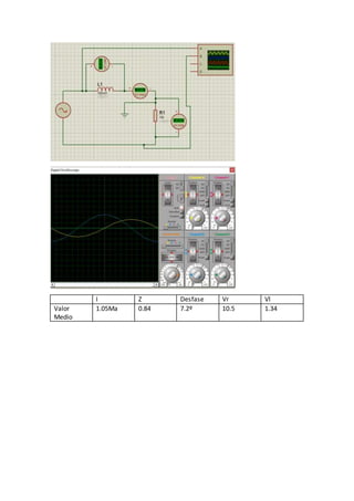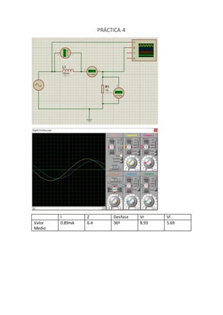 La práctica midió la corriente, desfase y voltaje en un circuito RL a diferentes frecuencias. Al aumentar la frecuencia, la corriente y el voltaje a través de la inductancia disminuyeron mientras que el voltaje a través de la resistencia aumentó, debido a que a mayor frecuencia la inductancia se comporta más como un cortocircuito.