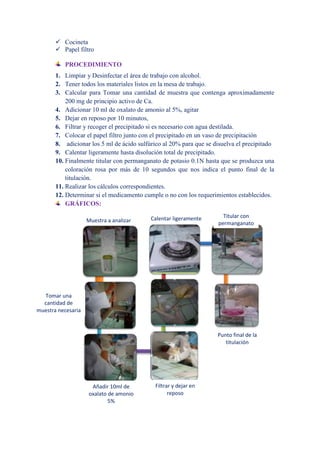 Este documento describe un procedimiento de laboratorio para verificar la concentración de gluconato de calcio en una forma farmacéutica líquida (ampolla) mediante permanganometría. El resumen incluye los materiales utilizados, el procedimiento que involucra la titulación con permanganato de potasio, los cálculos realizados y los resultados que muestran que la concentración del principio activo se encuentra dentro de los rangos establecidos.