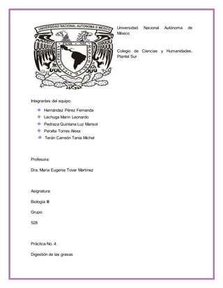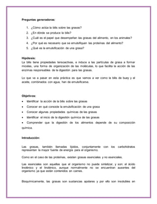 Este documento describe un experimento realizado por estudiantes de biología para analizar cómo la bilis emulsiona las grasas. En el experimento, se observó que cuando se mezcló aceite con agua se formaron gotas grandes, pero al añadir bilis las gotas fueron más pequeñas. La bilis emulsiona las grasas al fragmentarlas en gotas más pequeñas para facilitar su digestión por las enzimas. La bilis se produce en el hígado y almacena en la vesícula biliar, ayudando a digerir las grasas en el duod
