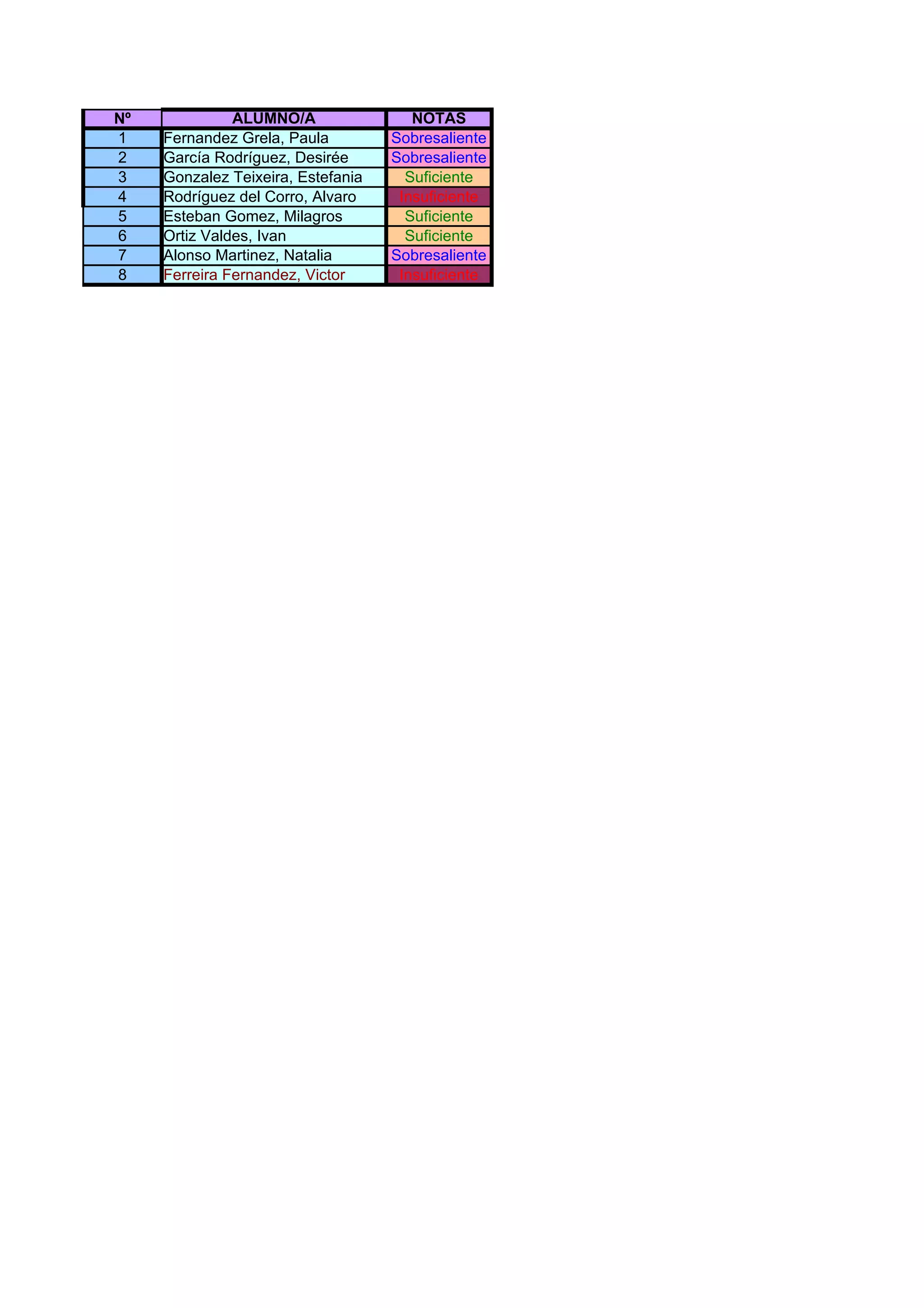 Este documento presenta los resultados de 8 alumnos en una asignatura, incluyendo sus nombres y apellidos y sus calificaciones que van desde Sobresaliente e Insuficiente, con la mayoría obteniendo calificaciones de Suficiente o Sobresaliente.