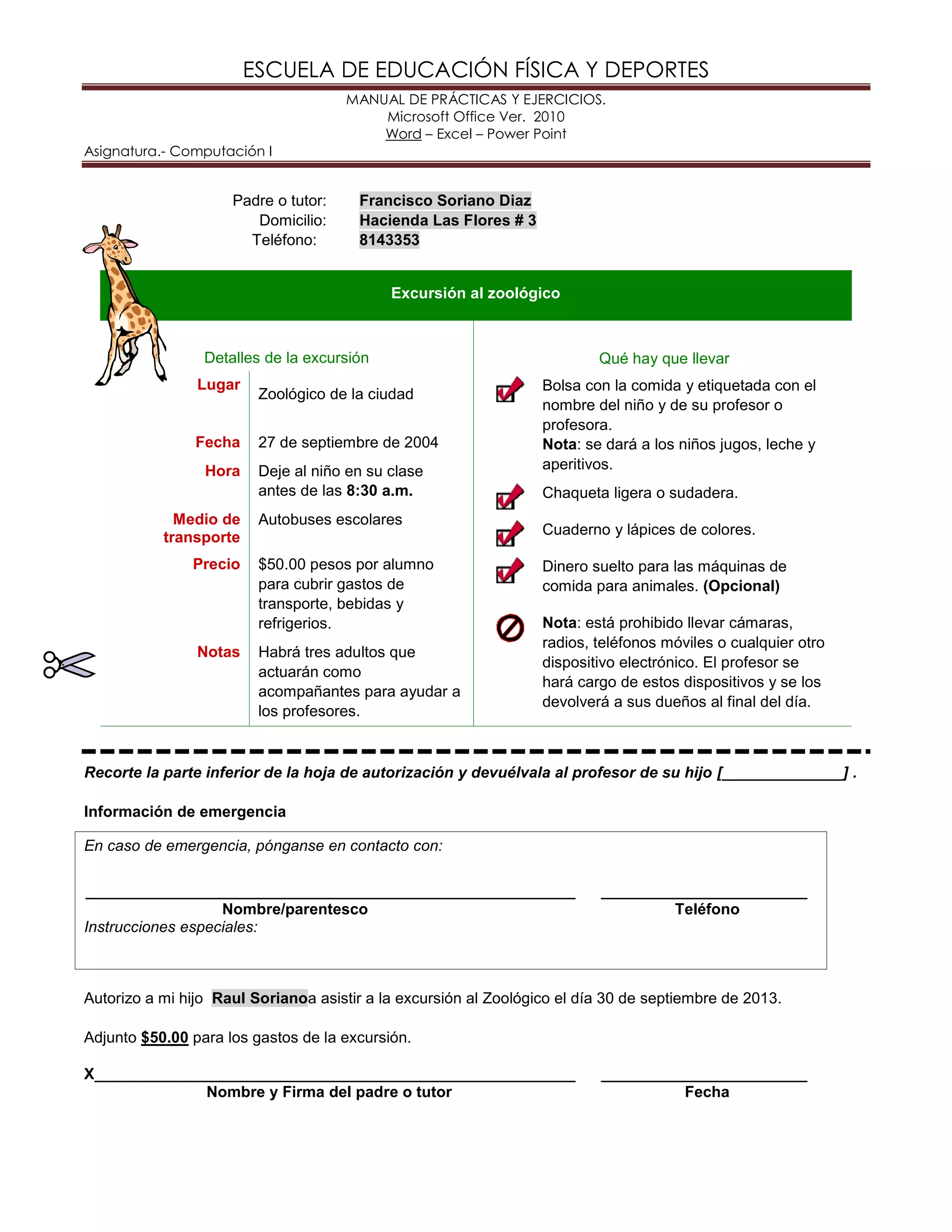 Este documento proporciona detalles sobre una excursión al zoológico para los estudiantes, incluyendo la fecha, hora, lugar, costo y lo que los estudiantes deben traer. Los estudiantes deben llevar una bolsa de comida etiquetada, chaqueta, cuaderno y lápices de colores. También incluye una sección para que los padres o tutores autoricen la participación de sus hijos y proporcionen información de emergencia.