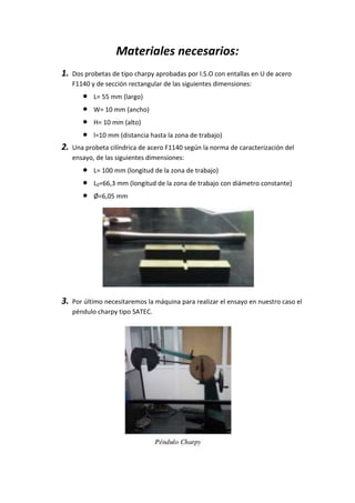 El documento describe un ensayo de impacto Charpy para determinar la fragilidad de materiales. Se utilizan probetas de acero sometidas a impacto por un péndulo. El ensayo mide la resiliencia del material, definida como la energía absorbida al fracturarse la probeta. Se detallan los procedimientos, cálculos y materiales necesarios para realizar el ensayo, así como los posibles resultados y su interpretación.