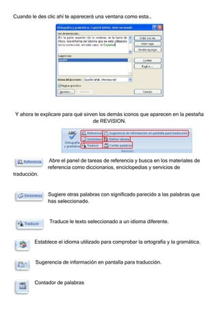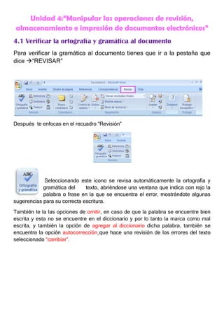 Este documento explica cómo revisar la ortografía y gramática de un documento electrónico usando las herramientas de revisión, aplicar opciones de autocorrección, controlar cambios mediante deshacer y rehacer acciones, y almacenar y imprimir el documento.