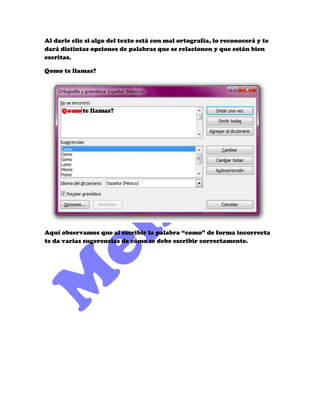 Este documento describe cómo manipular las opciones de revisión, almacenamiento e impresión de documentos electrónicos en Word. Explica cómo usar la herramienta de ortografía y gramática, aplicar opciones de autocorrección y control de cambios, almacenar documentos en la PC, y acceder a las opciones de impresión.