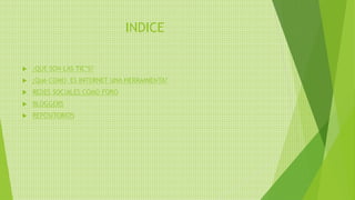 Este documento habla sobre las tecnologías de la información y la comunicación (TIC's) y cómo se pueden usar en el aula. Explica que las TIC's incluyen computadoras e Internet, y que Internet es una herramienta útil para los estudiantes porque les permite aprender a su propio ritmo. También discute cómo las redes sociales y los bloggers pueden usarse como foros de comunicación, y define un repositorio como un sitio centralizado para almacenar información digital.