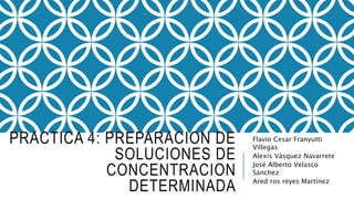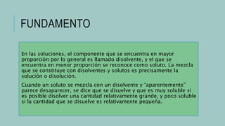 Este documento describe cómo preparar soluciones de concentración determinada. Explica que el componente mayoritario es el disolvente y el menoritario es el soluto. Luego presenta un diagrama de flujo del proceso que incluye pesar el soluto, disolverlo en agua, trasvasar a un matraz aforado, llenar a la marca y etiquetar con la información relevante. Finalmente muestra una tabla con las cantidades a usar de diferentes sustancias y los resultados obtenidos al preparar las soluciones.