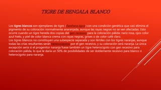 El documento presenta resúmenes breves sobre varias especies animales, incluyendo el tigre blanco, el lobo, el periquito australiano, el oso panda, y el conejo europeo. Cada resumen describe la especie, su hábitat natural, y su estado de conservación.