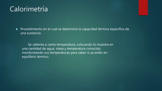 Este documento presenta información sobre calorimetría y capacidad térmica específica. Explica cómo se determina la capacidad térmica mediante calorimetría y las unidades en que se mide. Además, proporciona ejemplos de capacidades térmicas específicas de diversos materiales y resuelve problemas de cálculo relacionados con la capacidad térmica.