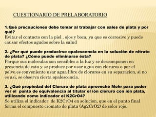 Este documento describe los procedimientos para realizar una argentometría, incluyendo preparar una solución de nitrato de plata 0.1N, estandarizarla mediante titulación con una solución de cloruro de sodio 0.1N usando cromato de potasio como indicador, y realizar titulaciones individuales de muestras de cloruro de sodio para determinar su concentración.
