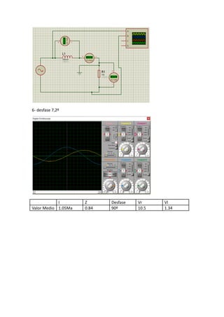 La práctica midió la corriente, desfase, voltaje de entrada y salida para diferentes frecuencias en un circuito RL. Al aumentar la frecuencia, la corriente y voltaje de salida disminuyen mientras que el voltaje de entrada aumenta, debido a que la impedancia de una bobina aumenta con la frecuencia.