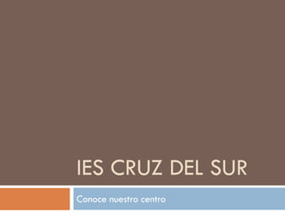 El documento proporciona información sobre el centro educativo IES Cruz del Sur. El centro abrió en 1999 y actualmente tiene 800 nuevos alumnos y 152 profesores cada año. Ofrece educación secundaria obligatoria, bachillerato y formación profesional de grado medio y superior, así como formación de adultos. Las instalaciones incluyen 6 departamentos didácticos y el centro participa en programas de intercambio. Se puede llegar en coche, bicicleta, autobús o tren a la dirección Avda. Antipodas.