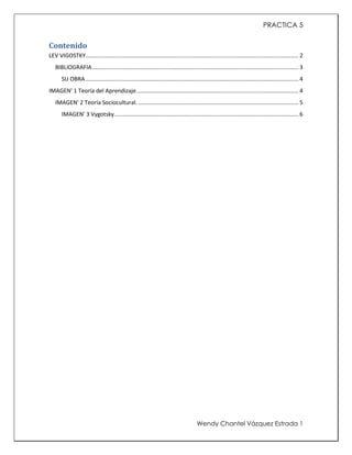 1) El documento describe la vida y obra del psicólogo ruso Lev Vygotsky, fundador de la psicología histórico-cultural. 2) Vygotsky desarrolló la teoría de que el desarrollo humano depende de la interacción social y la interiorización de herramientas culturales como el lenguaje. 3) El documento también resume conceptos clave de Vygotsky como la zona de desarrollo próximo y su visión de que el aprendizaje precede y posibilita el desarrollo.