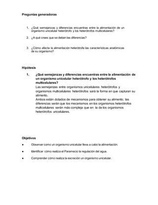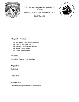 Este documento describe un experimento realizado por estudiantes de biología sobre la alimentación y excreción en Paramecium. El objetivo era observar cómo se alimenta y regula el agua este organismo unicelular, así como comprender su proceso de excreción. Los estudiantes observan cómo el Paramecium ingiere bacterias a través de su citostoma y las digiere en vacuolas, para luego expulsar los desechos a través de su poro anal. También identifican sus vacuolas contráctiles como mecanismo para regular el ag