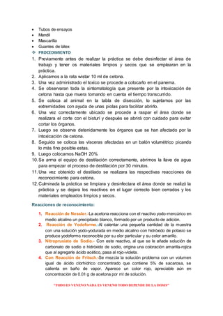 Este documento describe una práctica de laboratorio sobre intoxicación por cetona en una rata. Se administró cetona a la rata por vía intraperitoneal y se observó la sintomatología, incluyendo hinchazón, náuseas y vómitos. Luego de la muerte de la rata, se diseccionó para examinar los órganos afectados y se realizaron reacciones químicas en los órganos para detectar la presencia de cetona. El documento proporciona detalles sobre los materiales, procedimientos y resultados de